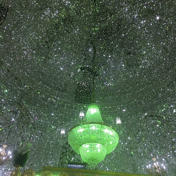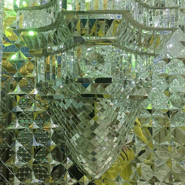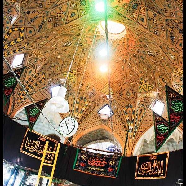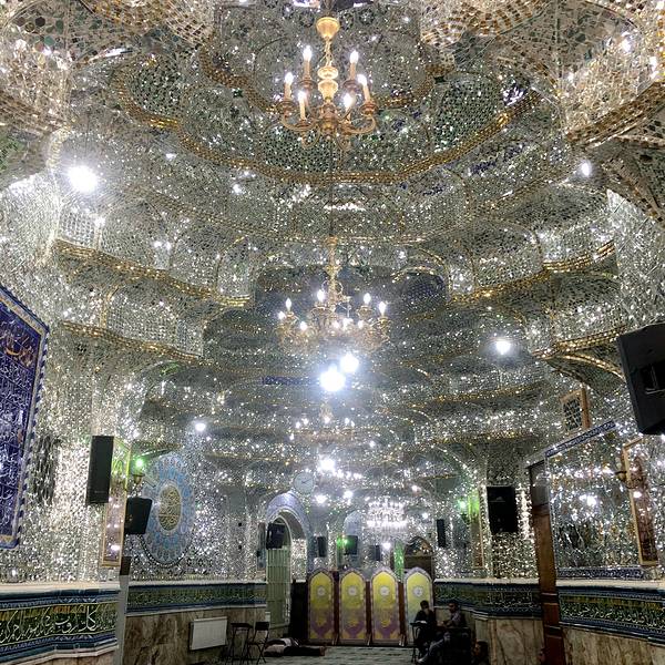 (此处插叙)后来回程的时候,一大早火车到德黑兰,还有大半天时间可以挥霍。去德黑兰的巴扎逛了半天。妹妹调皮想坐女性车厢玩,一个大婶不解,说你俩可以在同一个车厢啊!德黑兰的巴扎非常非常大,是中东地区最大、历史最悠久的巴扎之一。里面分为香料、地毯、铜器、服装等多个区域,无数小巷的总长可达10公里,错综复杂容易迷路,让人走到想哭。所以到这里最好有点目的性,勤问路。巴扎里偶遇一个清真寺,或者是个圣祠?好奇进去看看。里面面积不大,内室有一个圣棺。墙壁、屋顶都贴满了数不清的小镜片,bling bling很豪的感觉。估计我们在设拉子灯王之墓不得其门而入的圣殿里就是这种风格。只是这里比较小,建筑结构也不规整穷游锦囊说汽车西站是最大的站,刚好4号线可以到。寻思既然是最大的站应该会有车吧,于是就去了西站,谁知在西站口遇到疑似的工作人员告诉我们这里没有去卡尚的车,看起来又不像骗子(中国人久经骗场,可没那么好骗哦,哼~),只好又打的去南站。到卡尚的车费32万,车有点破,不过坐着还是挺宽敞,也一样发蛋糕饮料。