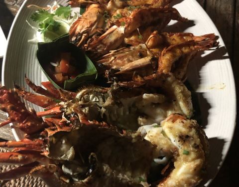 Ayana第二大餐厅,主打海鲜,和rock bar一样,都是沿海而建,风景很好,可以看日落。 餐厅人不多,可以不用预约。环保和服务都是极好的。 海鲜现点现做,送汤、主食和蔬菜。东西小贵,点了一千的龙虾海鲜套餐,千万别以为点餐区的拼盆就是全部,还包括烤串套餐和二份烧烤。量很足。 由于不知道套餐量那么大,又额外点了两份大串烧和生蚝,加上送的汤什么的,量真的太多的。 送的海鲜汤真的推荐,浓郁可口,里面有龙虾,用料赞。 烤串拼盘有鸡、牛和沙嗲,都很好吃。 生蚝刺身,配上柠檬和红醋,真的很新鲜爽滑。 烤海鲜里,鱿鱼、龙虾都不错。还有螃蟹,真的吃不下了。 大串烧不建议点,二百一串,又没有标价,买单的时候才看到价格,真的不划算。肉很大块,但有点柴,味道一般。 送的蔬菜是空心菜,炒的很香,很好吃。 吹着海风,吃着海鲜,烛光晚餐,真的很好的体验。二人去,点套餐就够了,不用另点别的。