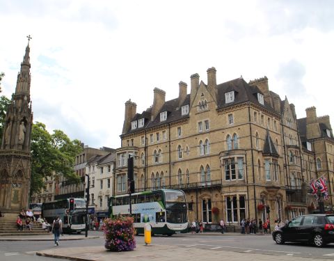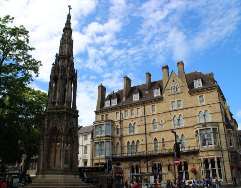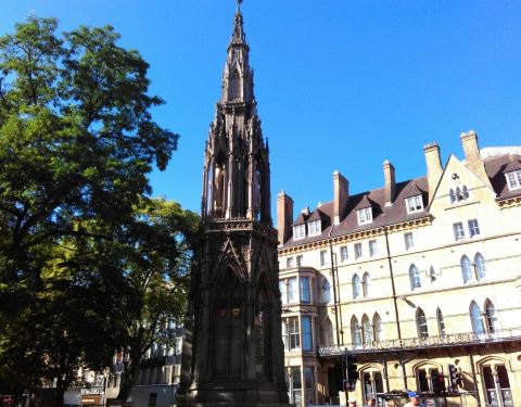 沿着Cornmarket Street步行街走到路口,是一个小广场,正中竖立一座建于1843年,纪念19世纪牛津运动的殉教士纪念塔(Martyrs Memorial)。