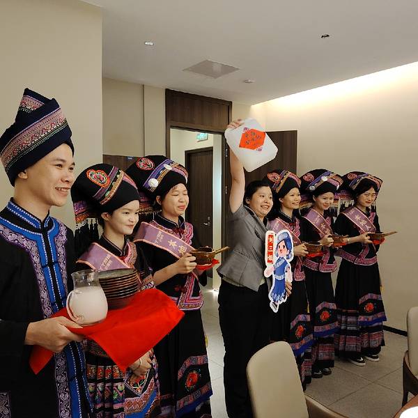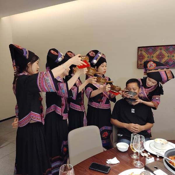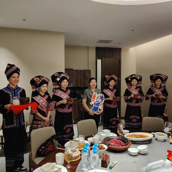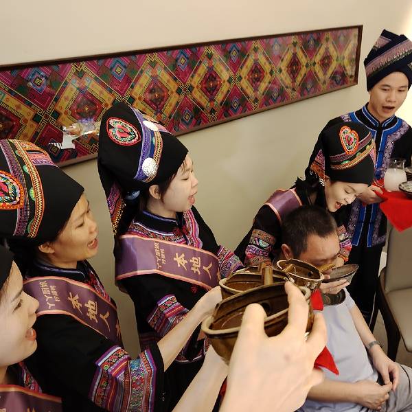 到南宁丫丫厨娘(喜荟天地店)吃饭,除了有好吃的菜,还有美女帅哥给大家唱山歌,送上糯米甜酒,来一出壮族的“高山流水”,让你吃得开心,喝得开心。