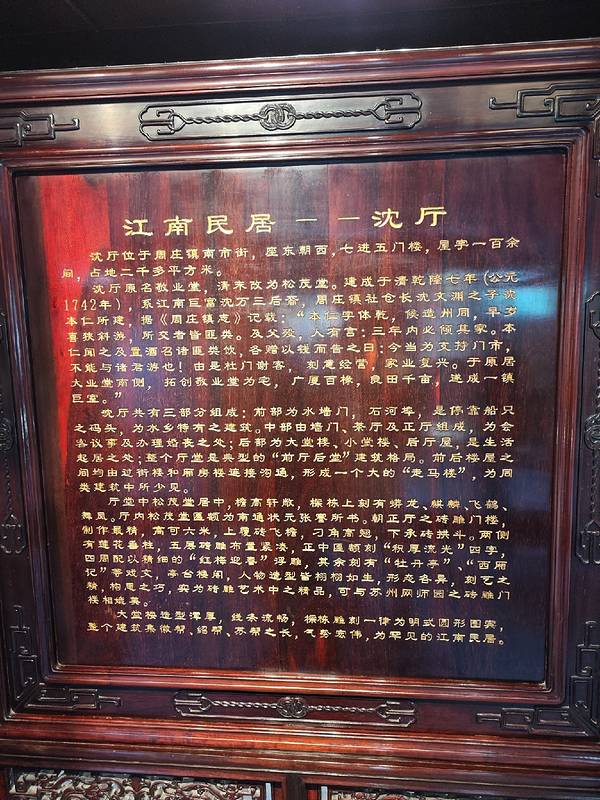 沈厅又叫做敬业堂。这里是沈万三的后人所建造的,来周庄的话肯定是要到这里看一看的,里面是很大的呢。 这里占地面积2900多平方米,砖木结构,单檐硬山顶,小青瓦屋面上筑哺鸡脊。面阔三间8.3米,进深8界9.2米,檐高2.9米,扁作构架。内四界前连鹤颈轩,后连双步。轩梁上刻有精美雕花,描金。