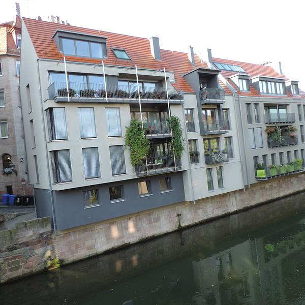 是紐倫堡老城區裏最美的景點 站在橋中央 可見河中小岛上的老房子 倒映在静静的水面上 而再沿着河岸向西