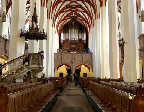 博物馆6pm关门,黄色的建筑有一种悠远的气息。在入口左侧的接待处,也是小商店,买完票后,我就进入了博物馆。进入后,免费租借了一个听讲器,还是有中文的,非常友好。博物馆有两层,有赫赫有名的巴赫家谱,出了无数位欧洲音乐史的巨匠人物。展品丰富多彩,详细周到,而在第二层,还有巴赫曾经弹奏的管风琴复原物。对广大音乐爱好者来说,这不亚于是圣物了。 我最喜欢的一个展品是巴赫的印章,JSB三个名字的缩写字母互相缠绕,形成一种极美丽的艺术感。据说,展览品中的一个藏宝箱,原本是教堂的募捐盒,就是因为一名游客偶然认出来巴赫的印记,才重获天日。让人意识到它的出处。