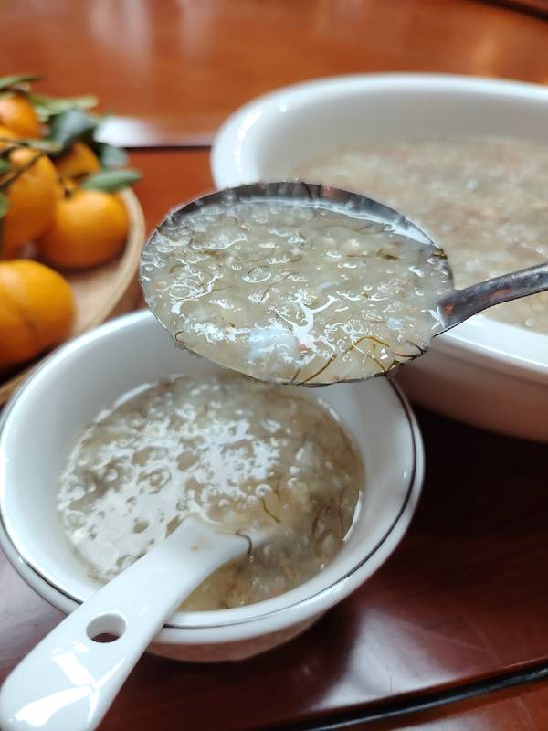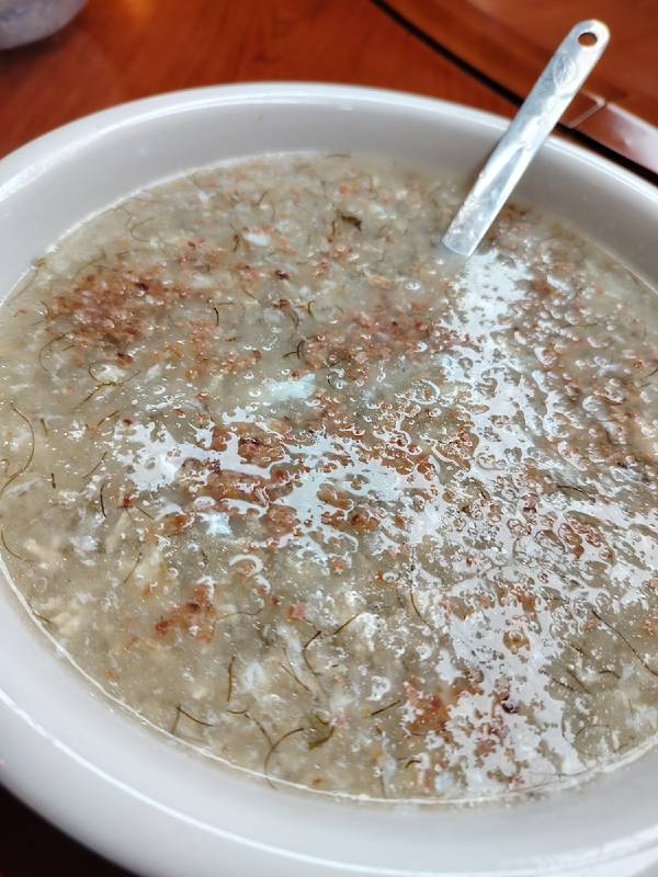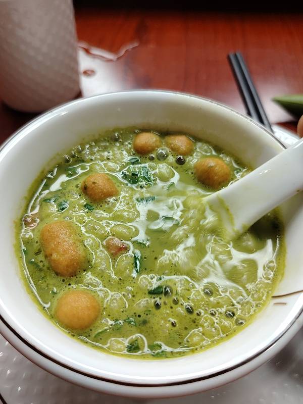 因为参加中国烹饪大师名人堂闭思维尊师师徒传承仪式,我来到了南宁桂大师私房菜,他家的油茶和鸡茸宴是一绝。 油茶带绿色的我是第一次见,说是独家秘方,喝起来顺滑醇厚。 鸡茸宴是南宁名菜,水鱼野生菌煲鸡汤、炸草鱼、煎越美黑米粽等,都有也桂菜特色,好吃得。