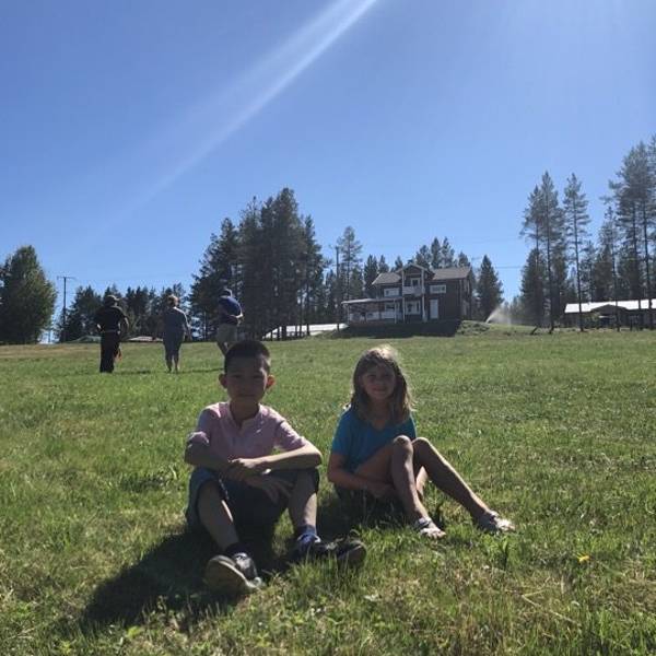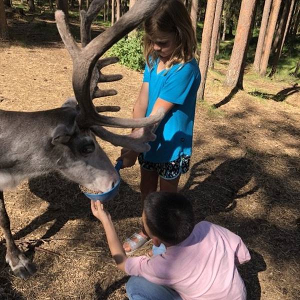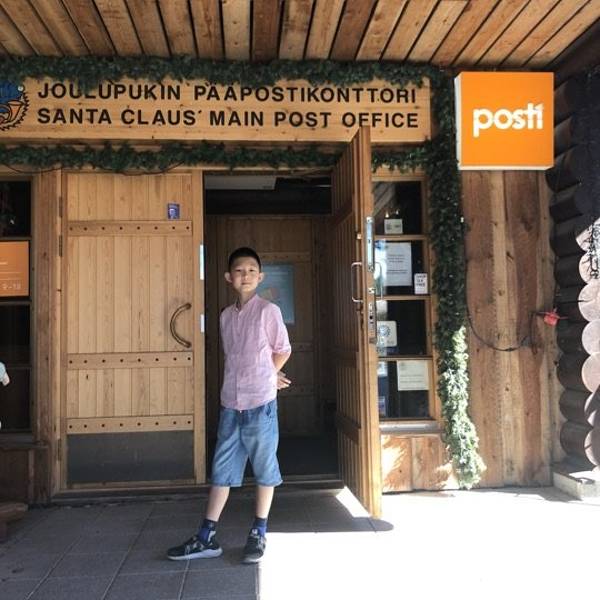 今天我们来到了罗瓦涅米圣诞老人度假村,这是一个很美丽,很有feel的城镇!一下火车就有开往度假村的巴士,很是方便。从巴士上下来圣诞气息扑面而来,虽然是夏季依然到处有圣诞🎄的标示。我们的holiday village 就在这个公园旁边,都是一栋栋的小木屋,夏季唯一的缺点是房间没有空调,很是热,因为在北极圈,晚上十二点左右才会日落,温度才会下降,我们一直在30度左右的屋子里睡觉,所以如果夏季来强烈建议只住一晚,或者干脆不要住在这里,住在市中心那里有空调的酒店。这里一个小时就逛完了真是应该住在市区,吃饭购物都很方便,当然冬季这里就是天堂般的生活。我们放下行李就直奔圣诞老人的家,淡季的好处是几乎不用排队就见到了和蔼可亲的老爷爷,这时候不用工作的他只是陪大家照个相,我们送给他一个脸谱挂件和刺绣的杯垫,他超级喜欢,也很开心。每次出国我都会带一些小小的中国风礼物,遇见喜欢的人或者有缘分的外国朋友都会送一些,也算是表达一下中国人的亲切和善意。可惜拍照不允许用自己的手机或相机,都需要从他们那里买到属于自己的照片和视频,如果你都想要价格不菲,大概需要五百人民币。拿到照片我们快速来到圣诞老人的邮局,认真的给小朋友们挑选了明信片和邮票,我写地址,儿子写祝福语,也是忙的不亦乐乎!这期间不知是哪个电视节目的还对我们进行了拍照采访,只可惜我英语太烂无法理解和表达,只允许给我们拍了照片,儿子兴奋的说我们的照片是否会放在这里,等我们冬天来看极光是不是就会看到自己的照片了!小伙子很是兴奋!下午慕溪给我们订了一个参观驯鹿农场的活动,一个叫Arie的家,整个农场和他的房子,他父母的房子混为一体,美丽的湖和一大片草原就在他们房子旁边,驯鹿们都在森林里尽情的生活,我们和他们来了一个亲密接触,并和德国一家三口一起喂驯鹿吃午餐,每人一个小桶按照他们吃饭的方式进行播撒,孩子们也很快玩到了一起,在农场里跑来跑去,追着农场主的牧羊犬,牧羊犬又追着兔子,真是一幅美丽的画卷!由于我们不是一个酒店,分别时我们也送礼物给德国一家和农场主,因为在一起这三个小时真的很开心!结束行程我们从酒店租了自行车,为了去超市来回十公里,上坡下坡很是疲劳,但是买到了能满足我的胃的方便面和酒也是值了!期待明天慕溪给订的一日游行程,明天见!