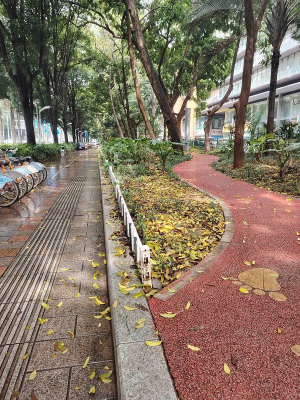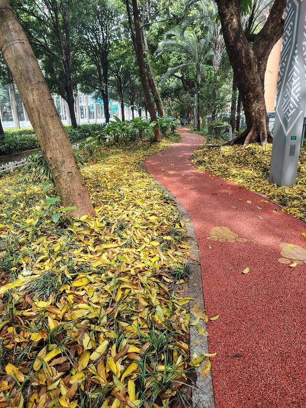 漫步路边小径,尽享夏日缤纷落叶之美。 夏雨骤歇,南宁民族大道的步道铺满黄叶。这不合时令的凋零,是树在抗议酷暑,还是雨太急迫?我踩碎一片,听见夏天在断裂的叶脉中轻笑——它早把秋的请柬,塞进了南宁的5月。