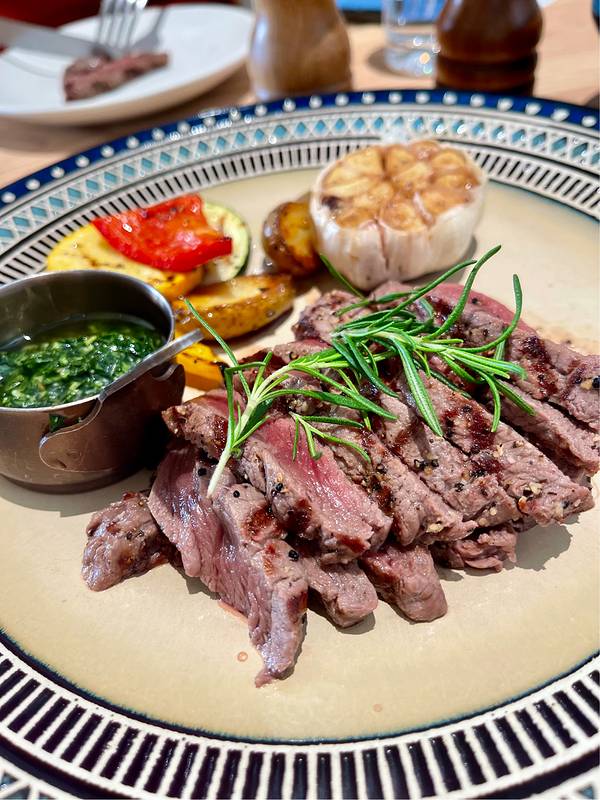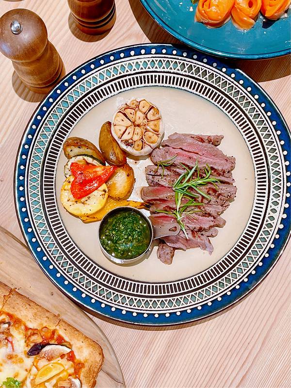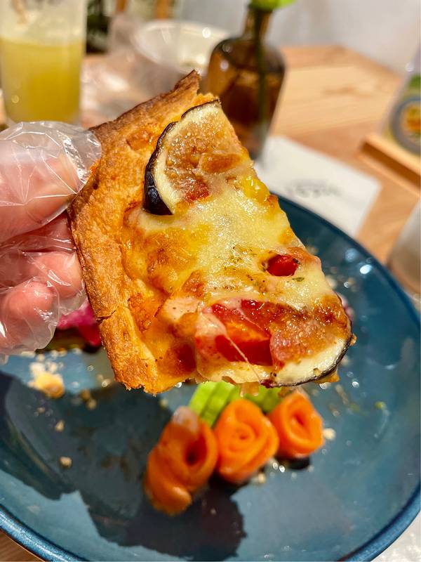 在蟠龙天地靠里边的蟠鼎路上,一个酒店的一楼,沿街的店铺。 下午五点多的时候,入口的那一块区域洒满了明亮灿烂的阳光;光线很强,很漂亮。 直接团购了双人餐,无花果披萨是当天最喜欢的一道,无花果有点微甜的味道,是刚出炉披萨的点睛之笔。 另外,牛排和三文鱼牛油果沙拉,口味也不错。