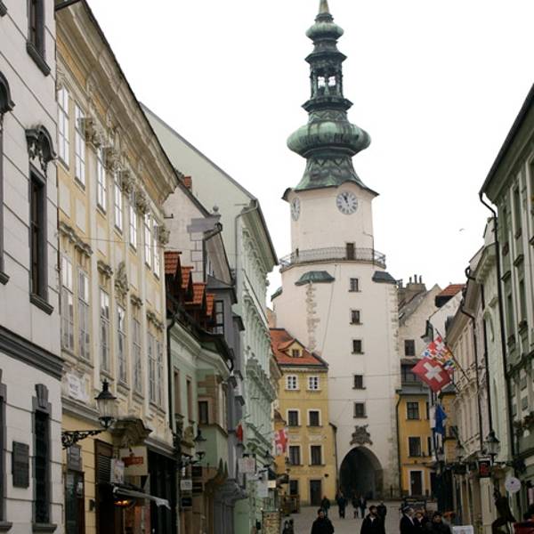 米哈尔门,布拉迪斯拉发的地标,旧城区的入口。门在14世纪就已建成,巴洛克式的屋顶是18世纪后加上去的