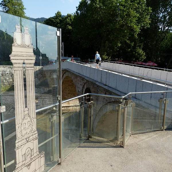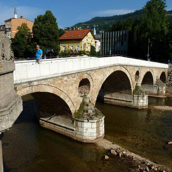 拉丁桥最早是1541年修建的木造桥,后被洪水冲毁。现在的桥梁修建于1798年。桥的街对面为一战爆发博物馆,存放了一些史料,对暗杀事件进行了详细的描述,并保留着与事件相关的物品,博物馆外停放着奥匈王储当年乘坐的敞篷轿车。