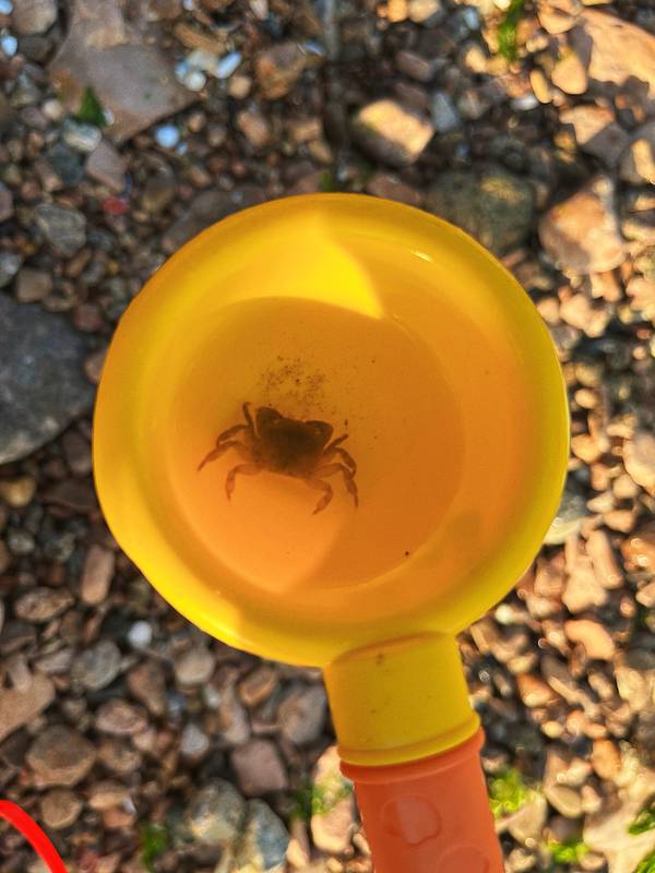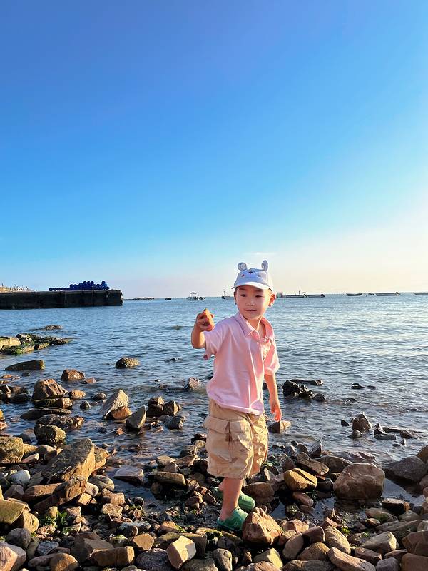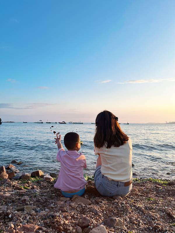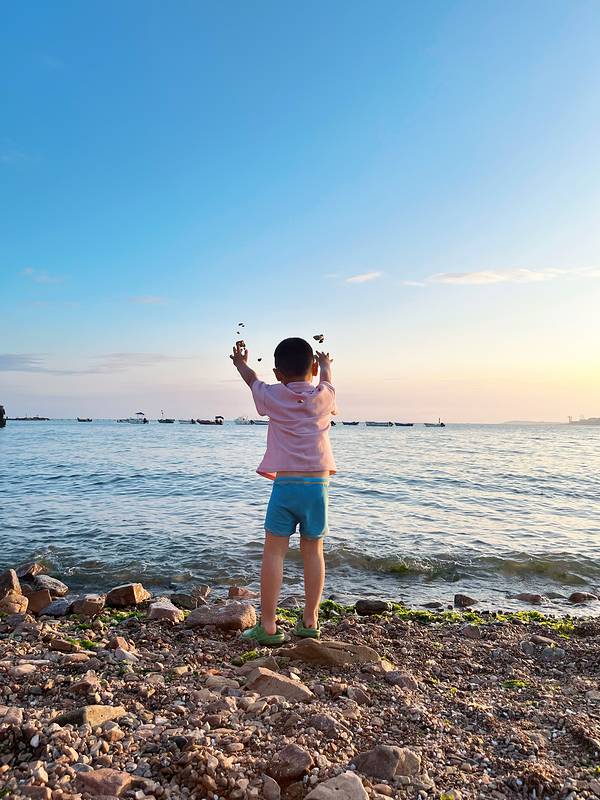 打车到达小麦岛,要走很长的路才能到海边,要是在西安小锦鲤肯定要抱抱,但今天很给力,出来这一趟仿佛一夜长大,小孩子还是要多带出去走走哇。 到了之后立马被眼前的美景所征服。这也太美了吧。环岛一周后,在小麦岛的右侧找了一个布满礁石的海边锦鲤扔石头,我抓螃蟹,不一会抓到一只小螃蟹锦鲤给取名叫谢谢,谢谢很活泼,在桶里面来回横着走,还表演胸口抱大石,看得我和锦鲤哈哈大笑。锦鲤就在这个地方往海里扔石头扔了一下午,也把墨镜扔丢了。昨天丢的是防晒帽,真的是一天丢一个东西,老母亲心碎了。但也在日落时分看到了最美的夕阳。也就扔了一下午石头吧天色暗下来,于是和小锦鲤跟着人流往出走,去往出口那条路很长很长,路的右侧是大海,边走边听着海浪一遍又一遍的拍打着海岸,海风吹着脸颊,与海浪的声音交织在一起,那一刻很惬意。一路上锦鲤嘴里叽里呱啦说个不停,一会儿给我讲他的谢谢要吃啥喝啥,一会儿给谢谢介绍我。真的很欣慰,陌生的城市里,我们俩又很愉快的度过了一天。不对,是我们三,还有他的好朋友谢谢。