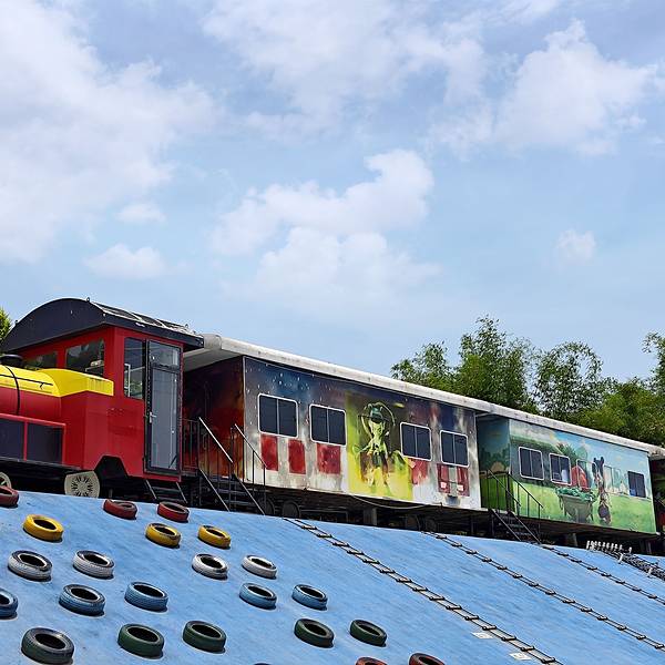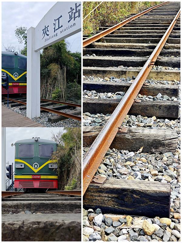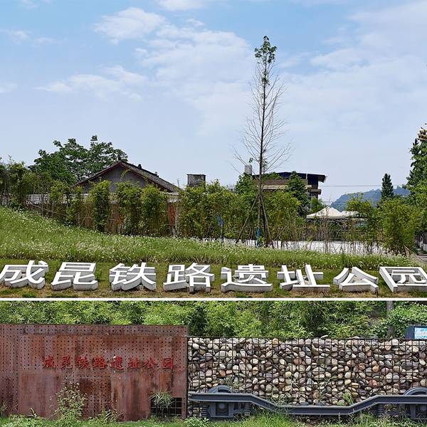 从亭子处往下走,便到达老成昆线遗址公园。 成昆铁路遗址公园利用原成昆铁路废弃铁路轨道,开入一段绿皮火车,旁边还有儿童游乐区及怀旧文创区。