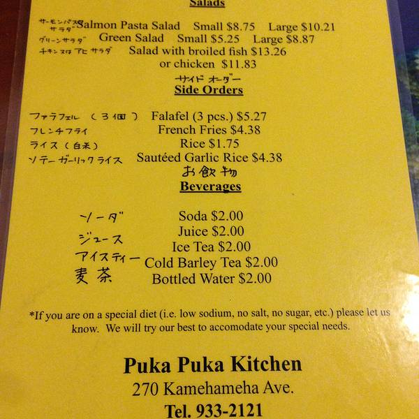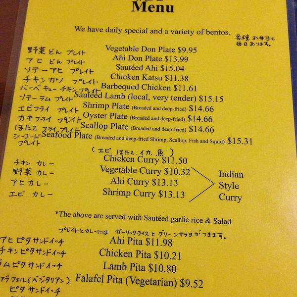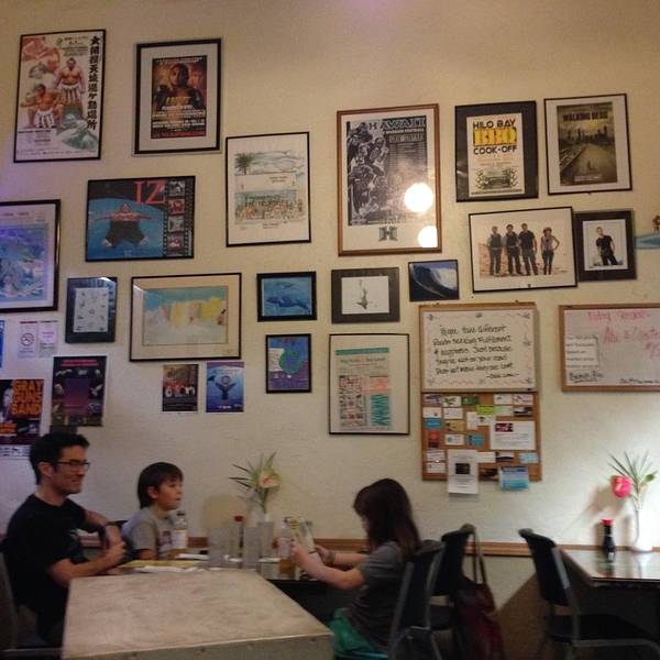 地址:270 Kamehameha Ave Hilo, HI 96720。 电话:(808) 933-2121。 营业时间:周一到周六早九点半到下午两点半;周四周五晚五点半到晚八点半,餐厅不接受提前预订。 付款方式:接受信用卡支付,Visa Master均可。 小费:需要支付10-15%的小费。 停车:餐厅没有免费停车位,需要找街趴。餐厅处于Hilo繁华的街道上,街趴不太容易找。 用餐环境:传统的夏威夷菜式餐厅装潢简单,规模不大,有五六张桌椅。推荐菜式: Garlic Rice炒米饭,虽然点主菜的时候就会陪,但一定要单拿出来说说,这炒饭的味道相当的好吃啊,可以和国内的美食味道媲美。 Seafood Plate,各种油炸的海鲜,有鱿鱼、大虾之类的,配沙拉和炒饭,好吃。Chicken Kutsu,炸鸡排,配沙拉和炒饭,也很好吃。另外,他家羊肉也很好吃,可惜当晚没有了;Ahi Don生鱼饭也是岛上传统的菜式,都值得尝试。