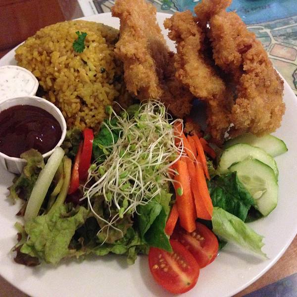 Chicken Kutsu,炸鸡排,配沙拉和炒饭,也很好吃。另外,他家羊肉也很好吃,可惜当晚没有了