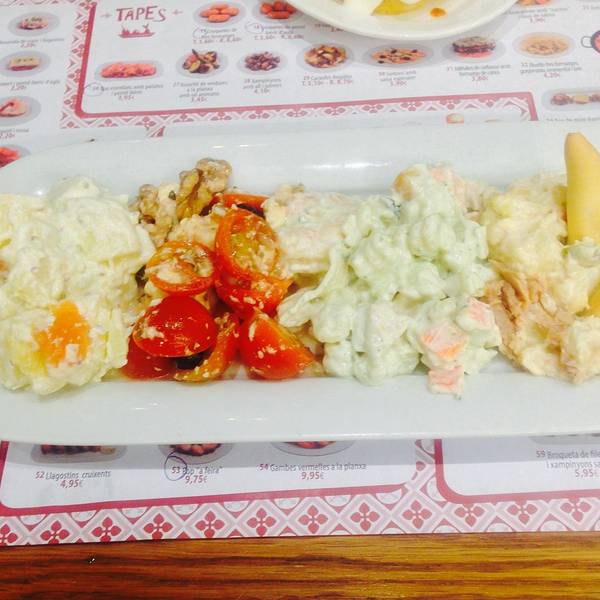 巴塞罗那餐厅1 西班牙没干别的主要是吃了,推荐几个吃过的餐厅。 先推荐一个最喜欢的,由于海鲜要趁热另外桌子没地方放相机,点的海鲜就拍了一张 La Paradeta-推荐,性价比不错,在TA上评价很高 Tips:8点开门,要排队,老板挺事儿的,早到不给拿号不让进,就得生排着。我们去的是城堡公园旁边的,圣家大教堂边上还有分店。 排队先点海鲜,分号就坐,叫号那吃的