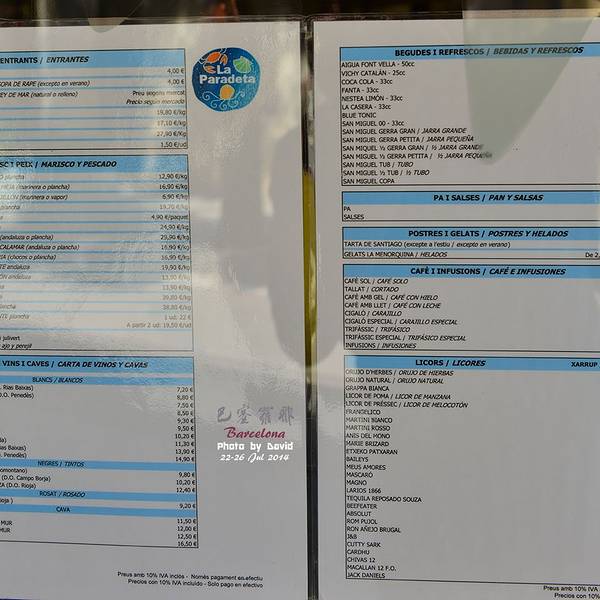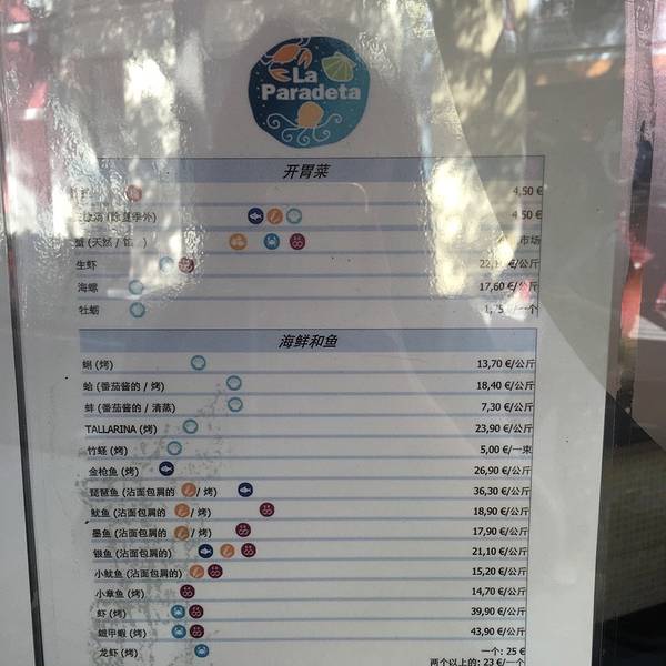 售卖的海鲜新鲜诱人,品种蛮多的,有的论份量卖,有的论个头卖,总体价格在巴塞罗那算是很便宜的了。看着这些新鲜的龙虾和大虾,我们只能饱饱眼福了,等下次有机会再来这里品尝吧……刚开门就有那么多食客在这里排队采购海鲜,准备就餐,可想而知这家餐厅的生意有多火爆了,而且多数都是当地人在这里就餐。La Paradeta圣家堂店的地址:Passatge Simo, 18, Barcelona, Spain 离开圣家堂不远,是参观完后安排餐食的好地方。把它家的餐单贴给吃货们,有想法的可以提前做好功课安排去那里饕餮一下!
