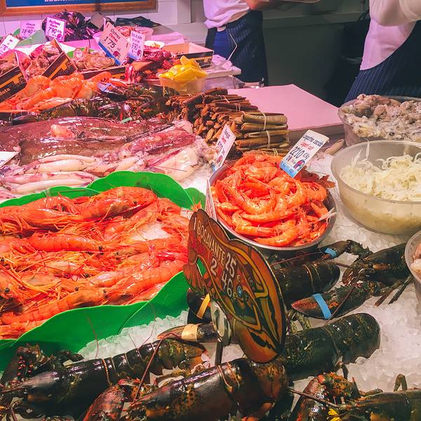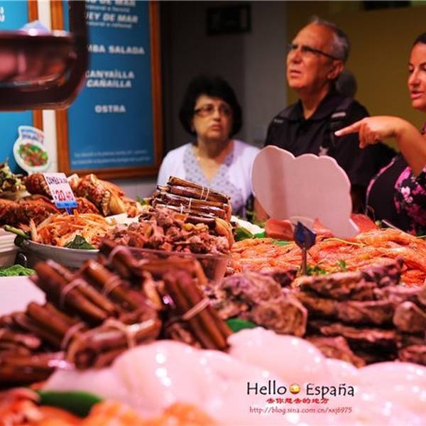 售卖的海鲜新鲜诱人,品种蛮多的,有的论份量卖,有的论个头卖,总体价格在巴塞罗那算是很便宜的了。看着这些新鲜的龙虾和大虾,我们只能饱饱眼福了,等下次有机会再来这里品尝吧……刚开门就有那么多食客在这里...