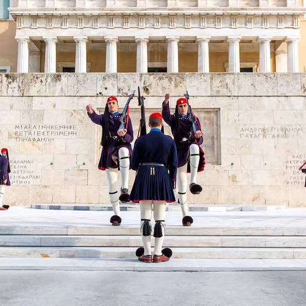 这种服装很特别,外套袖口宽大,马甲上有着精美的刺绣,靴子前有一个大的绣球墙面上的墓碑刻着士兵浮雕,墓碑两侧分别用 希腊 文刻着两句名言:“青山处处埋忠骨,白云无名做灵床”。两名卫兵守卫在碑的两侧,他们穿着一种名叫埃布佐纳斯的传统民族服装。这种服装很特别,外套袖口宽大,马...墙面上的墓碑刻着士兵浮雕,墓碑两侧分别用 希腊 文刻着两句名言:“青山处处埋忠骨,白云无名做灵床”。两名卫兵守卫在碑的两侧,他们穿着一种名叫埃布佐纳斯的传统民族服装。这种服装很特别,外套袖口宽大,马甲上有着精美的刺绣,靴子前有一个大的绣球。每逢整点,他们会踩着奇特的步伐举行交接仪式! 展开