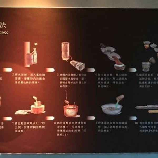 ...矿石、采矿工具等,同时,馆内设有炼金过程的示范,矿石碾碎后,用摇金槽将沙分离出来的情景值得一看九份金矿博物馆,馆内展出珍藏的矿石、采矿工具等,同时,馆内设有炼金过程的示范,矿石碾碎后,用摇金槽将沙分离出来的情景值得一看。