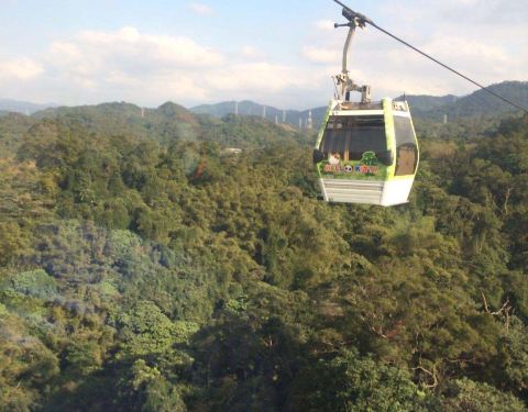 由台北市立动物园西侧至猫空地区,全长4.03公里,共有4站,分别是动物园站、动物园内站、指南宫站和猫空站,每辆车可坐6-8人,需20分钟左右的时间)坐缆车(周一不营业,9点营业)直接到山顶。