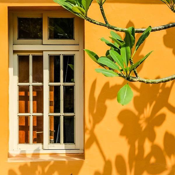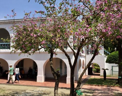 门口一面黄色的墙与白色的窗框,和院落中的高大灌木树上盛开的黄色小花,让迎面进来的我为之一振。