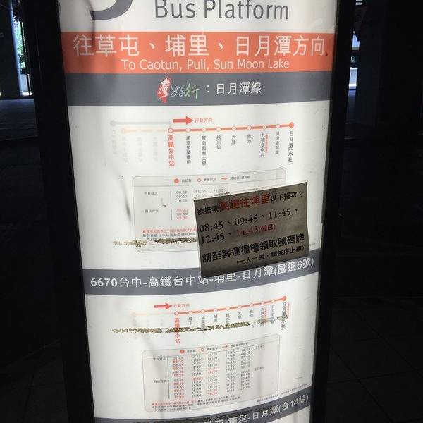 台中高铁出来到下图的好行客运站牌,非常好找。按指示牌就OK了。图中一共三条线路,最上面是1小时30分好像,中间是1小时20分,下面好像是2个小时左右吧。记不清楚了。可用悠游卡。排这个队之前,我们在7-11加值了...台中高铁出来到下图的好行客运站牌,非常好找。按指示牌就OK了。图中一共三条线路,最上面是1小时30分好像,中间是1小时20分,下面好像是2个小时左右吧。记不清楚了。可用悠游卡。排这个队之前,我们在7-11加值了新台币1000,合每卡,各500。刚刚站过来没多久,就来了一班。工作人员说是最快的那班。于是~~~启程~~~