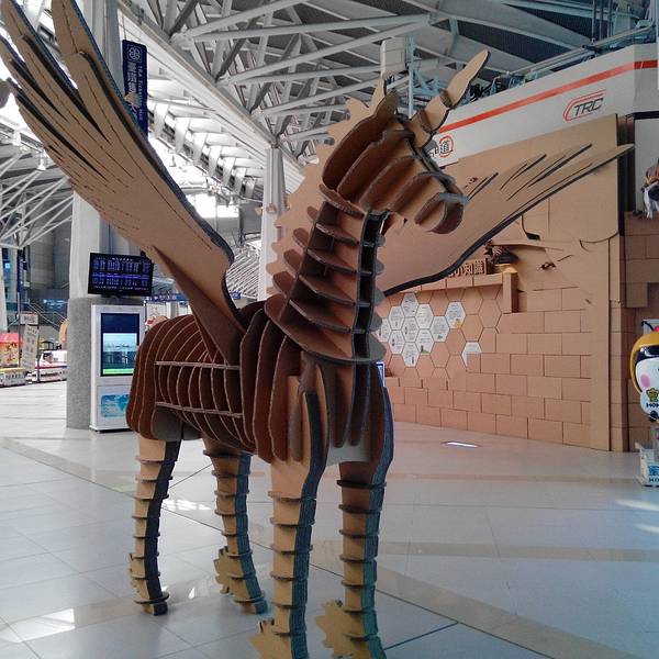 台中高铁站,非常漂亮你能想象以下布景全是纸箱做成的吗?用纸箱做的飞马,很有创意秀色可餐呀!在高铁站买的日本料理,味道一般!台湾高铁