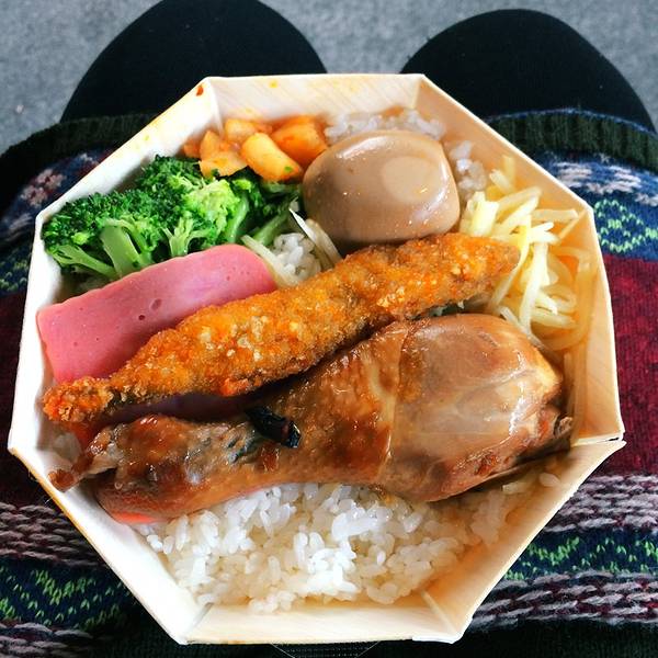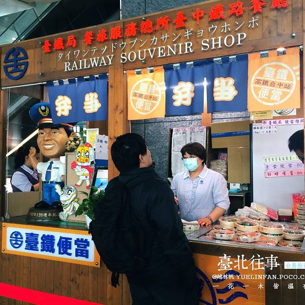 从郑州飞到桃园机场,不过2个多小时,抵达时正是中午时分。第一日,不在台北停留,待到跨年夜再回来,直接向南进发。下了飞机,赶紧租借了wifi,在机场坐接驳大巴到桃园高铁站(约20分钟),取了桃园→台中的高铁票。为了避免新年人多买不到票,我是提前在网络上订好,信用卡扣款,到了取票机直接输入验证码即可,非常方便。↑时间紧迫,午餐就地取材,就在高铁站解决。独特的台铁“八角便当”可是当地铁道文化的特色呢!在火车站常有这种小亭子,门口站着可爱的“列车长”的卡通形象。↑一份简单的便当内里丰富,鸡腿、大排、西兰花、胡萝卜、卤蛋,营养丰富。不过,像我这种“吃饭不喝水会噎死星人”还是觉得这种饭食太过干瘪,没有菜汁的浸润,显得干巴巴难以吞咽。↑嫌便当太干,我去711买了关东煮。做好的关东煮会很人性化的用环保纸做的提篮兜起来,便于携带。味道嘛,确实一般般~↑