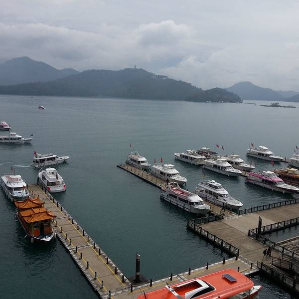 从玄光寺码头俯瞰日月潭,看到了好热闹的水上交通线。