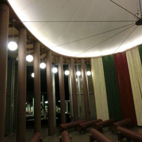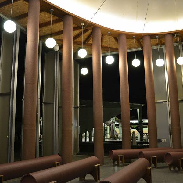 值得晚上來欣賞,趕快來喔「紙教堂」落在青綠的草坪上,進到紙教堂內共有五十八根紙管支撐起整個教堂,室內與室外的長管椅也都是用紙製作的,教堂裡使用溫暖的黃色燈系,給人一種溫馨沉靜的感受。值得晚上來欣賞,趕快來喔!