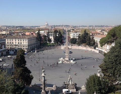 人民广场,由17世纪罗马建筑师丰塔纳建造,该广场是三条放射形干道的汇合点,靠近鲍格才家族公园(borghese park),广场中央有一座方尖碑,周围设有雕像,布置绿化带。在放射形干道之间建有两座对称的样式相同的教堂。 人民广场概况 人民广场中央建有高24米的方尖塔,狮子喷泉守在四周。一进门左边的教堂就是艺术品宝库的圣母玛利亚•德鲁•波坡罗教堂。有很多布拉马特、尼尼、卡拉巴乔的作品。广场的南面是被称为双胞胎教堂的两座很相像的教堂。以教堂为圆心有3条道路从广场呈放射状态通向各方。 广场周边 在左前方的巴布依诺大道平行的麦尔古塔大道的小胡同里,有高档安提克的商店和时装商店,是很有罗马味道的地方。右边的大街是卖食品等普通市民的街道,有传统的鱼鲜,还有意大利菜馆。人民广场左边的小山丘就是平丘。从这个山丘上眺望广场的金色非常美丽。 人民之门 广场的边上是人民之门(Porta di Poplol)。在还没有铁道的时代,旅行者从弗拉米尼亚大街穿过人民之门到达广场,再进入罗马城是惯例。歌德、拜伦、济慈都曾经穿过这道门。人民之门是3世纪修建的,17世纪时为了纪念瑞典女王克丽斯汀访问罗马由贝尔尼尼加上了装饰。