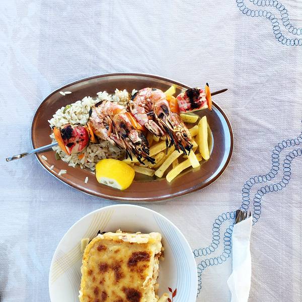 锡拉夏岛上点的午餐,希腊特色食物马拉他馅饼,是肉沫➕芝士➕意面7欧。还有烤海鲜8欧。