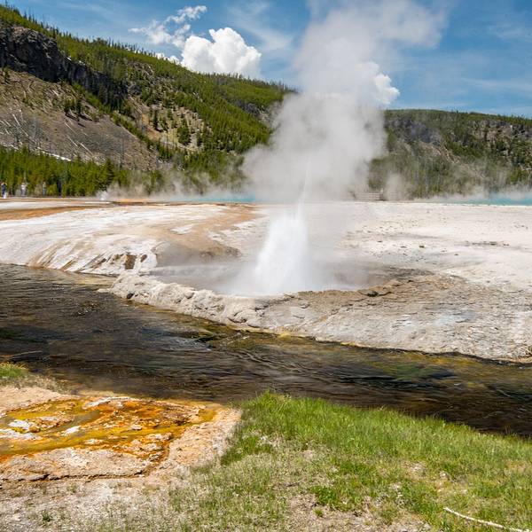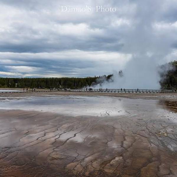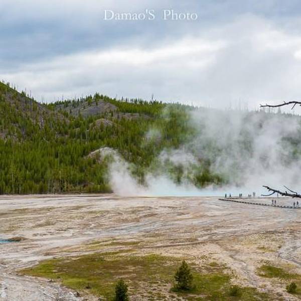 ↓比利时人池(Belgain Pool)大间歇泉(Grand Geyser)是最高的可预测间歇泉,不同于老忠实泉,爆发时只有一根水柱,大间歇泉喷发时,周边的几个泉眼相继喷发,最后一起大面积地强力喷发。想像一下,几个老忠实泉聚集一起,同时喷发,会是什么样的景观?声势浩大,蔚为壮观,那便是Grand Geyser喷发时的景像。