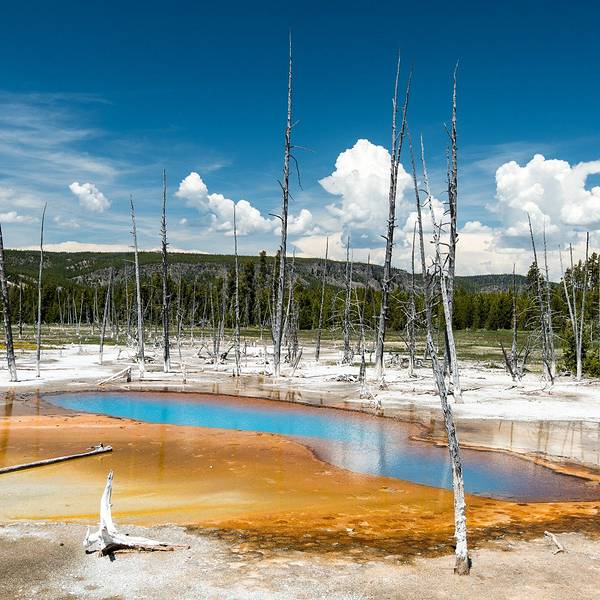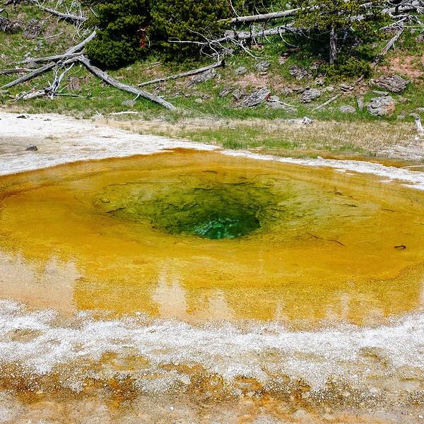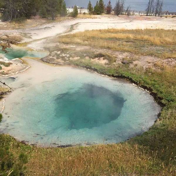 ↓彩虹池(Rainbow Pool)乳白池(Opalescent Pool)是相对于这里的其他热泉来说温度较低,所以表面看上去及其冷静,大量枯死的树在其周围,像是一个个士兵,努力守护泉池中仅剩的鲜亮。