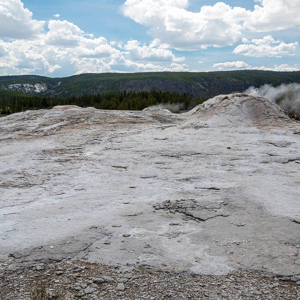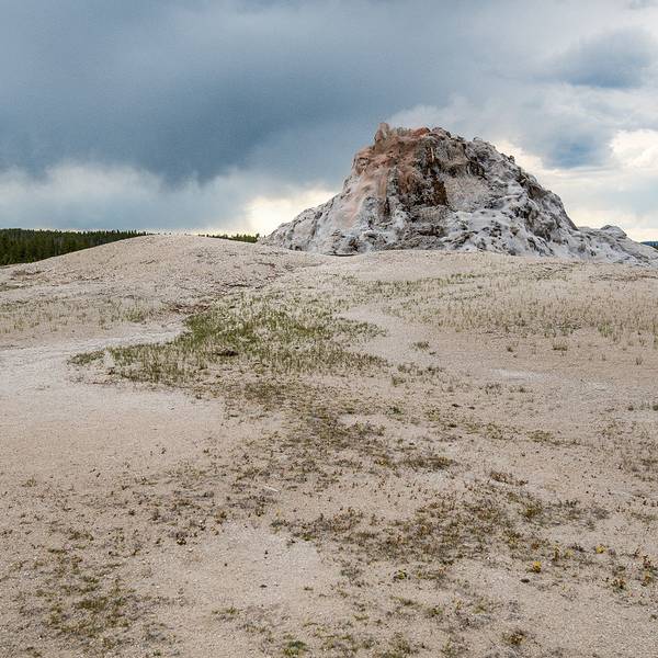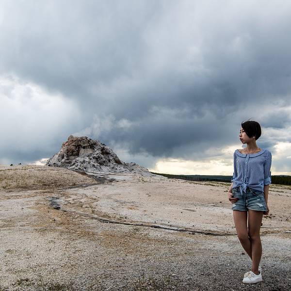 尽管此时乌云压顶,但也丝毫没有阻止我们想要一探究竟的好奇心。沿着火洞河环线(Firehole Lake Drive)开,注意这是一条单行线,开到底,有一个停车场,旁边就是白圆顶间歇泉(White Dome Geyser)。它已经存在了几世纪之久,是黄石最大的圆锥体间歇泉之一,并且随着每次喷发,仍然在不断成长中。