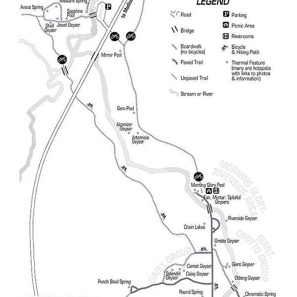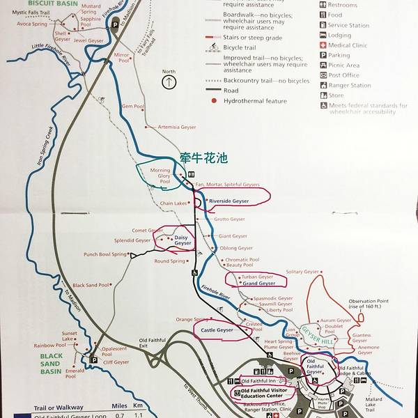 Tips:地图有两张,要结合起来看哦!第一张主要是间歇泉山(Geyser Hill),也就是老忠实北边那一圈热泉,以及停车场的位置;第二张是沿火洞河往西北方向走的热泉分布。中国泉(Chinese Sping),有没有很像中国地图,我们到的时候它正好在不断的冒泡,像是一锅煮沸的开水,感觉随时都有可能喷涌而出。
