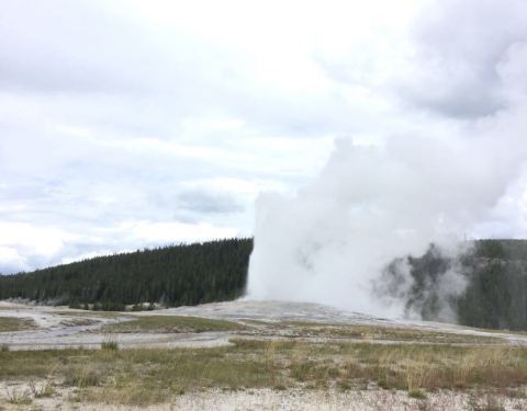 ↓牵牛花池(Moring Glory Pool)从牵牛花池返回停车场,由于走的是环线,不用再走木栈道,直接从水泥平铺的马路回去即可,此时的我们早已累瘫,但收获了如此多珍贵的回忆与照片,再累也值得。再一次经过老忠实,看到白色的烟柱已经非常明显,周围的长凳上也已经坐满了游客,毫不犹豫的加入了他们。大家都屏住呼吸,相机,手机早已准备好,满心期待着喷涌而出的热流。只听见“哗~”的一声,水流如期而至,越来越高,形成了一个几十米高的巨型水柱,直窜向天际,和空中的云朵融为一体,最后像烟花一样在空中绽放,滴落在四周的硅华上。虽然老忠实泉的喷发间歇一直在增加,已从最初的45分钟间歇时间,升至如今的90分钟,但它的喷发规律依然稳定,容易预测,所以它从不会让游客失望,总是如约而至。只要你身在黄石,不怕欣赏不到它喷发而出直冲天际的水柱。