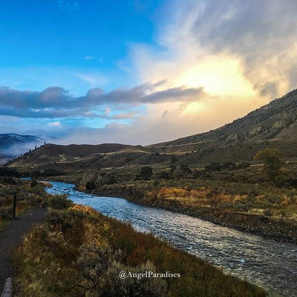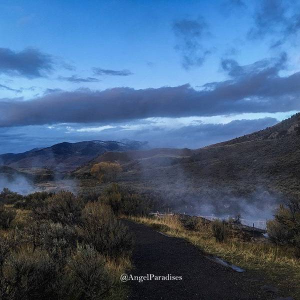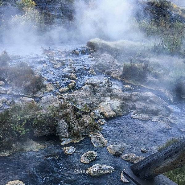 那天下午,我们顺着河流默默地走向山谷深处,我一个人落在了队伍的最后,周围安静地有点毛骨悚然,想转身看看后面有没有什么人或动物的,结果一转身竟被一片山谷夕阳美景给震住了!从来没有见过如此壮丽绚烂的自然风光,简直如一幅油画般细腻,美的太让人不敢相信!随着山谷烟雾越来越浓烈,温泉也就越来越近了。温泉周围没有木屋或栅栏让人换衣物的,最近可以换衣服的地方也只能是停车场的厕所,虽说黄石才下几天雪,山谷的气温仍是非常低,不可能穿着泳衣裹毛毯来回500米。观察好地形后,我们是第二天早上来泡地温泉,直接把游泳衣穿里面,外面套着宽松外衣,带上酒店大浴巾,从温泉出来快速擦干身体套上外衣再换衣服,反正这个天泡黄石温泉还是要非常有勇气的!说实话,泡会儿温泉出来并有想象得那么冷,感觉还是棒棒哒!这样一片山谷,一边是美腻夕阳,一边是烟雾缭绕,指环王里的仙境也不过如此。所幸用手机记录下那一刻,否则连我自己都会怀疑那个美景是在梦里出现,而并不是真实存在过。