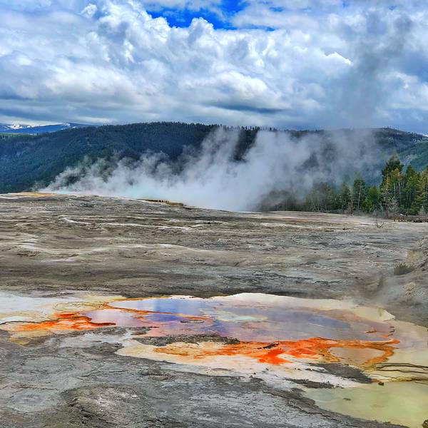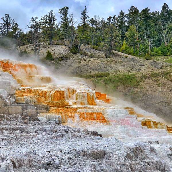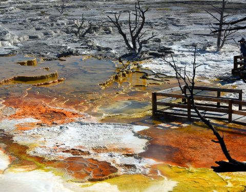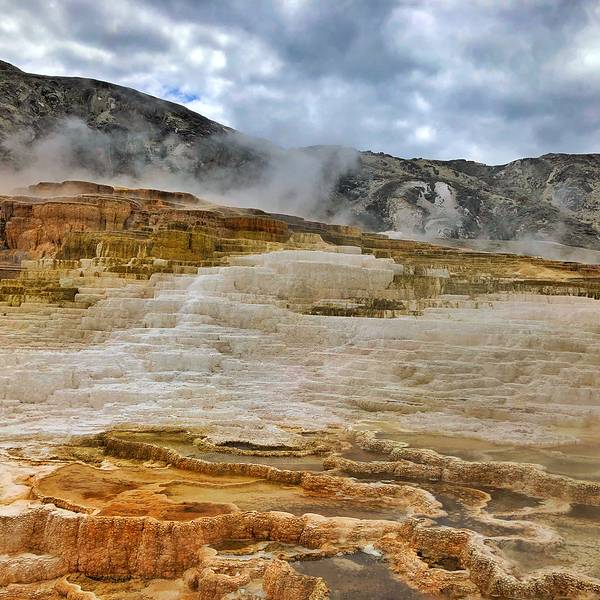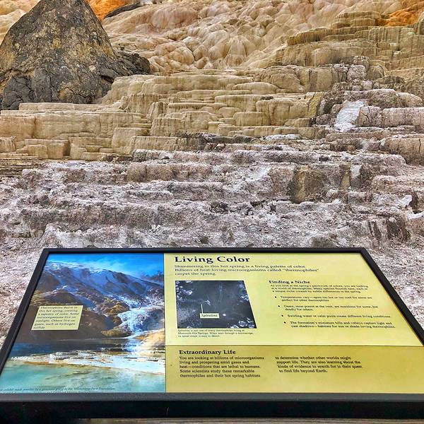 水温非常高导致很多在温泉中生长的藻类使得温泉的颜色呈现出棕色、橙色、红色,形成了一个七彩的大台...猛犸热泉(Mammoth Hot Springs)