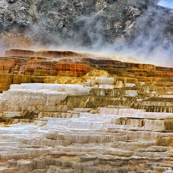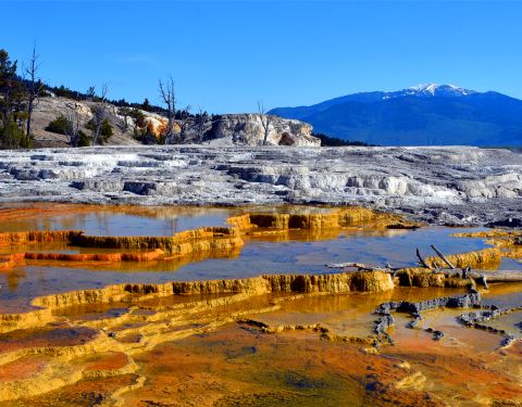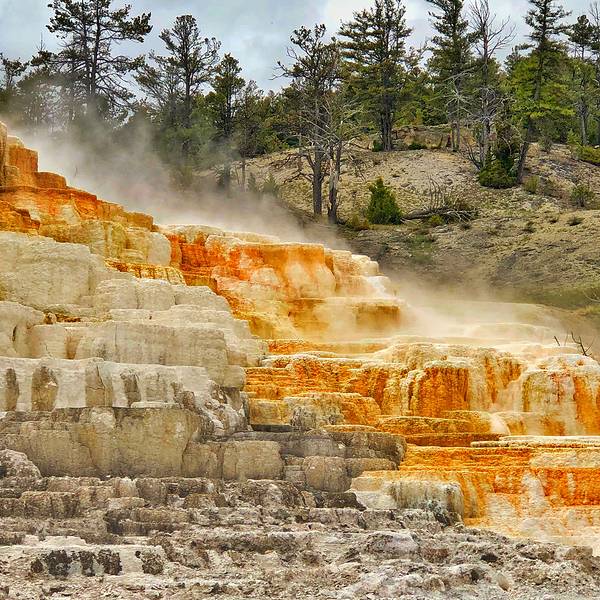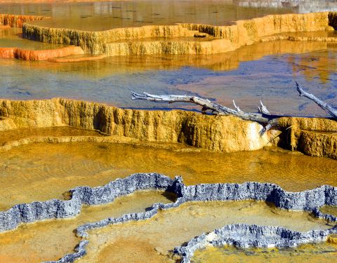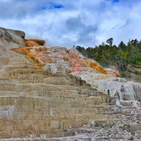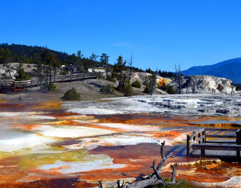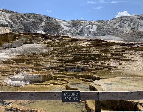 猛犸象温泉(Mammoth Hot Springs)是世界上已探明的最大的碳酸盐沉积温泉。其景观以石灰石台阶为主,也称热台阶区,可分为上台地(Upper Terraces)和下台地(Lower Terraces)。猛犸象温泉的泉水来自于诺里斯间歇泉盆地,水温可达77℃,很多藻类生活在温泉中,使得温泉的颜色呈现出棕色、橙色、红色和绿色。奔流不息的温泉随着阶地奔腾而下,且颜色各异,形成了一个七彩的大台阶,景象非常恢宏壮观。