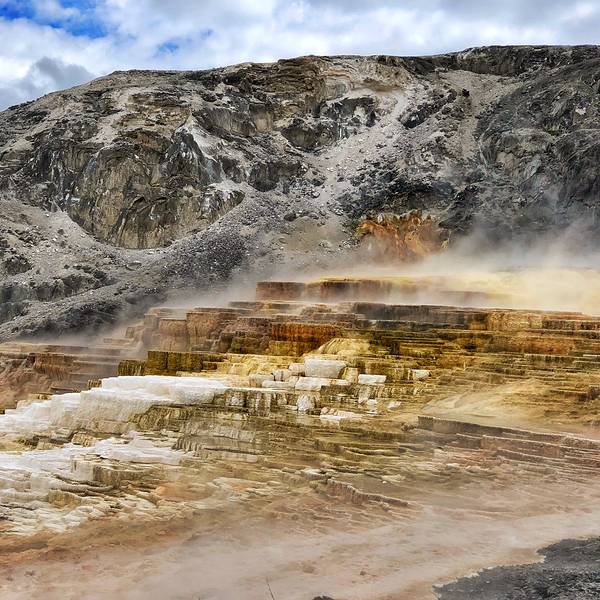 猛犸象温泉在2002年的一次地壳运动后,大部分热泉停止了活动,导致大量微生物死亡,使猛犸象热泉失去了颜色,死掉的细菌也变为了灰白色的粉末,残留在乾枯了的大台阶上。