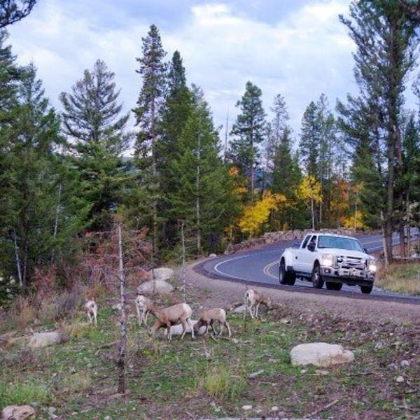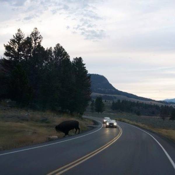 头顶的犄角像把弯刀,旁边的外国人还会提醒你不要靠近。在黄石赶夜路很危险天色渐晚,一路狂奔,在Tower fall附近遇到了某种羊一家。头顶的犄角像把弯刀,旁边的外国人还会提醒你不要靠近。在黄石赶夜路很危险。看看过路的野牛,这要是全黑下来,路上遇到一头,会是很可怕的事情。