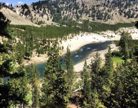 停车场停好车,沿小路走三百米可到观景点,观景点地势较高,基本是平视Tower Fall,也可以从观景点处的步道一直向下走到底部在瀑布的对面观看,继续往黄石河边走,风景会更漂亮,河岸布满白色巨石,两边是黄红相间的山峰。