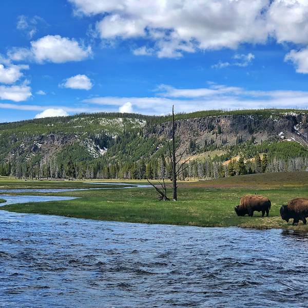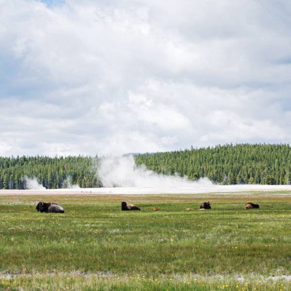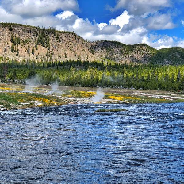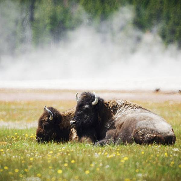 几只野牛悠闲地趴在草地上,身后就是温泉冒出的热气进入西门逆时针向南走,路旁就是火洞河(firehole river),可能因为河边分布着很多大大小小的喷着热气的间歇泉而得名。