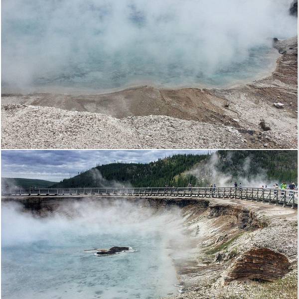 无意中发现了烈日周围居然有彩虹出现,不知道这是否是彩虹还是日晕,但是我们觉得特别好看,快速拍下...Firehole(火洞)河河边湖光山色令人陶醉,河边野牛成群的在吃草。一口一个美洲野牛,好霸气。周边还有三个蓝色的温泉。这个叫做黑珍珠的泉,泉口乌黑。这个泉的名字有点意思,叫做芥末泉(MUSTARD SPRINGS ),...Firehole(火洞)河河边湖光山色令人陶醉,河边野牛成群的在吃草。一口一个美洲野牛,好霸气。周边还有三个蓝色的温泉。这个叫做黑珍珠的泉,泉口乌黑。这个泉的名字有点意思,叫做芥末泉(MUSTARD SPRINGS ),原因是这个泉的出口处的颜色像黄芥末。这是一个不规律的间歇泉,喷发时间很短暂。喷发开始前,出口处的水面开始上升,慢慢开始沸腾,先小后大,然后归于平静。这个叫做Avoca的泉实际上也是一个间歇泉。之所以叫做Spring 而不是Geyser,是因为在1959年大地震之前它并不活跃。地震后变为间歇泉无意发现了爱心形状的温泉,这个应该是个野泉,都没有名字,暂时我们给它取名叫爱心泉(love spring)吧。走在木栈道上一抬头,无意中发现了烈日周围居然有彩虹出现,不知道这是否是彩虹还是日晕,但是我们觉得特别好看,快速拍下来,持续时间很短。 展开