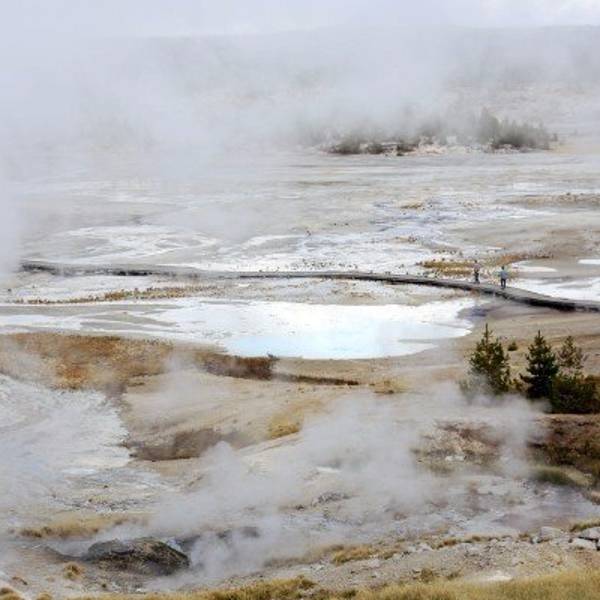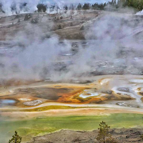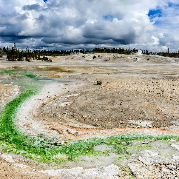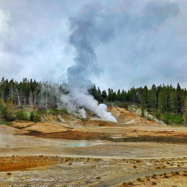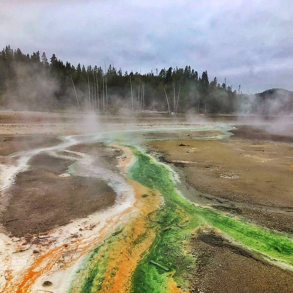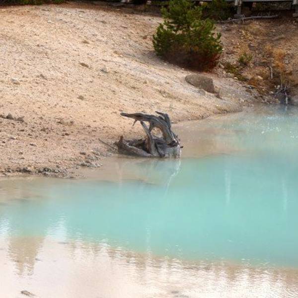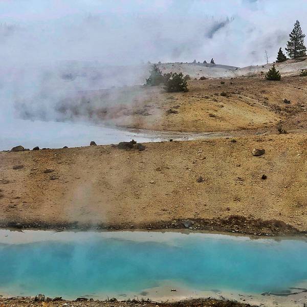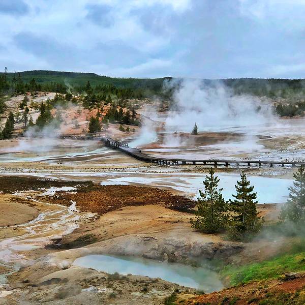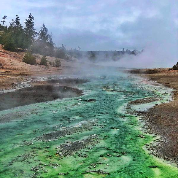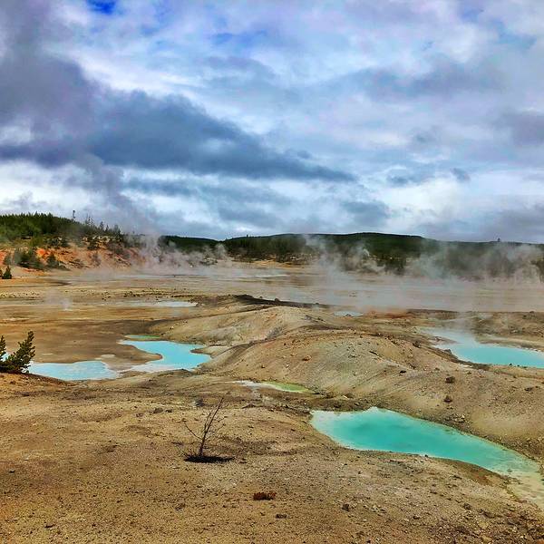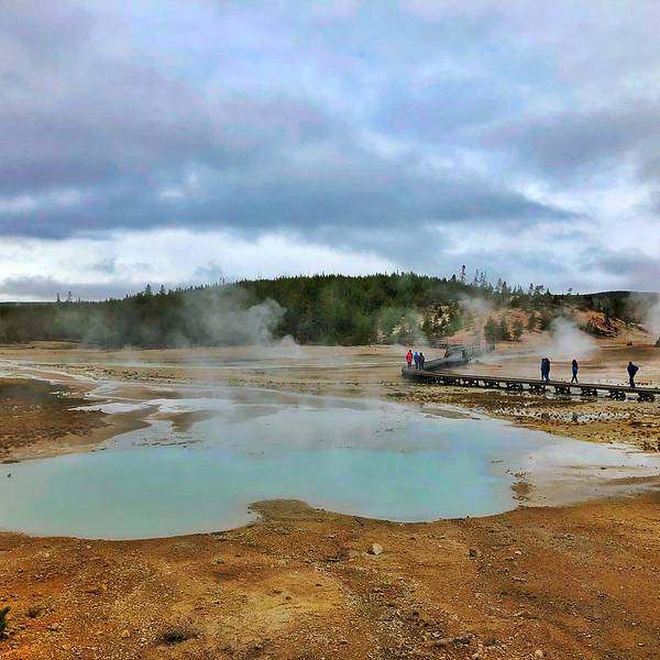 本来想径直前往猛犸象热泉的,无奈发现8字型左上的公路又封路,又!封!路!我了个去,又得多绕60多miles好么!!这几天被黄石公园的封路搞得有点无语啊!于是先去Norris Geyser Basin去逛逛,这片名为Porcelain的热泉盆地如期名字,整片平原都是洁白如瓷器,入口处便是凶猛的蒸汽冒着嗤嗤的响声,滚滚白雾扑向天空,这里可以看到绿色和棕色的小溪,还有乳白色的岩石中宝蓝色的小热泉,仙境一般!