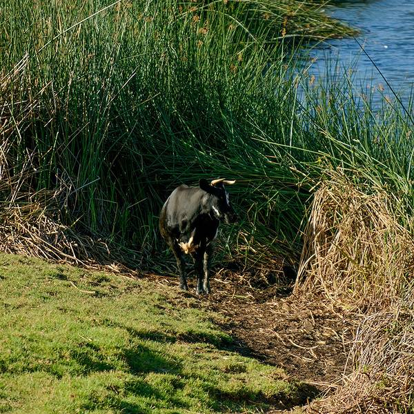 正当我准备在最后时刻做出闪避动作的时候,这牛从鼻子里喷出几束粗气,突的转个弯又跑到一片芦苇旁边站着了,随后就一直把我们直直的盯着。这,到底是个什么情况啊?在牛快上撞上我的一瞬间,我都已经做好可能会受伤的最坏准备了,虽然我到现在都没搞明白为何这头牛要攻击我们。