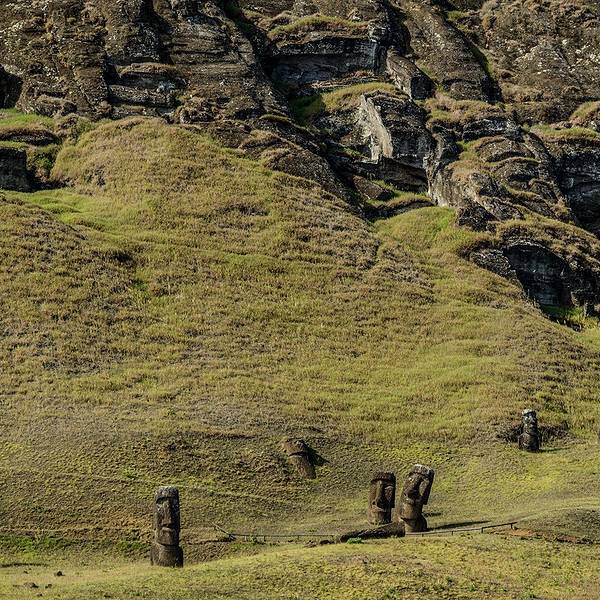 当我从取景器里看到这个场景时,此时也跟我曾在玩大航海时代OL时那迷恋的画面完美的重叠在一起,不由得身体都轻轻的微颤了下。只见山坡上到处都是石像的身影,只不过却并不全是站立之姿。在这片由冷凝岩形成的山体上,还有无数具大大小小尚未完成的摩艾石像,镶嵌在山体上。这些摩艾们斜靠在山体上,看着凿痕,有些已经快要完成,有些则刚刚有个轮廓,可最后,它们都被时间凝固在了这一刻那怕就算远远的望着这些横七竖八或站或躺着的石像群,心中的震撼都已扩张到极致。这是一片仿佛自成世界的土地大地之上,一尊尊石像犹如守护者般在其上延伸着