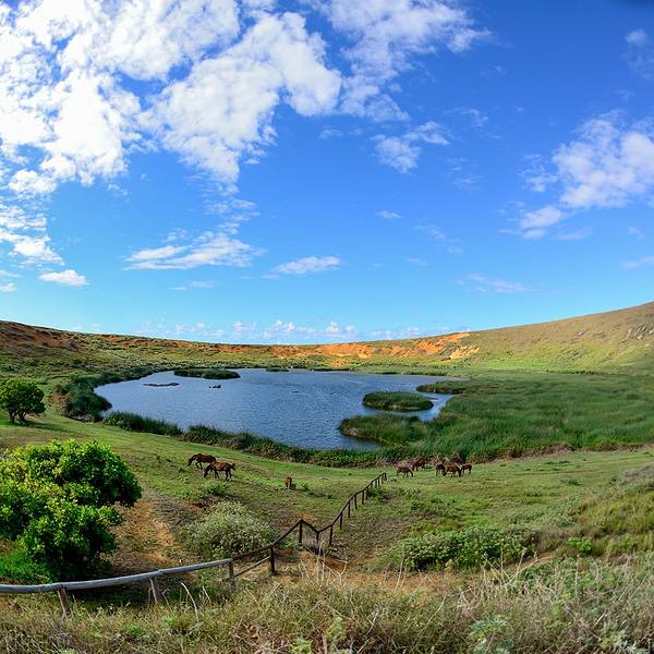 这个火山口的直径大约为650米,湖深12米。不过不像拉诺考火山口的地形那般凹陷陡峭,整体内壁呈现比较平缓的坡度。有十来匹野马在湖边悠闲的游荡,登到高处向下看,蔚蓝色的火山湖面居然被芦苇占据了一半的面积从这里也能看到昨天我和阿乖登上的那火山有匹野马安静的站在天际线上在火山口内侧,数十尊各种姿势的巨人石像遍布山坡其中的部分石像也跟外侧山坡上的一样,被土石掩埋了身体据统计,在内侧的山坡上一共约有117尊完成和未完成的巨人石像。