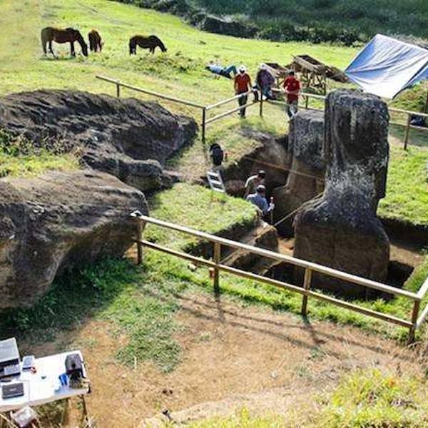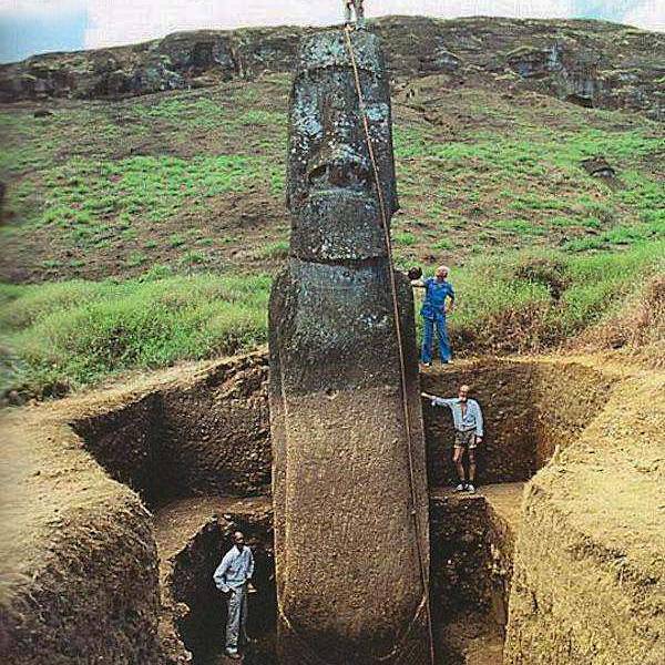 要从内侧将石像运出去,应该要更艰难更麻烦几倍吧。在更高的山坡上,还有许多尚未完工的石像。看到二尊被木栅栏围起来的石像,原来这是复活节岛巨石像的挖掘勘探项目,只是如今已经被重新填埋上了。这里借用几张来自网络的图片,展示一下当时挖掘的情况虽然事先就能猜到石像埋在地下的身体会非常巨大,但是这两座身高7米的石像,最终通过挖掘后显露出来的庞大身体,震憾感还是超过了我的想象。