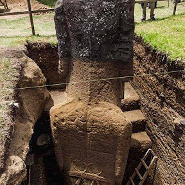 而让人疑问的是,这尊造型唯一的石像是用远在数公里外的一座火山口的赭红色火山岩造凿成的,跟此处所有用灰黄色火山岩所凿成的巨人们都不一样,而且也就它几乎被完全埋在了地下,颇具神秘色彩。